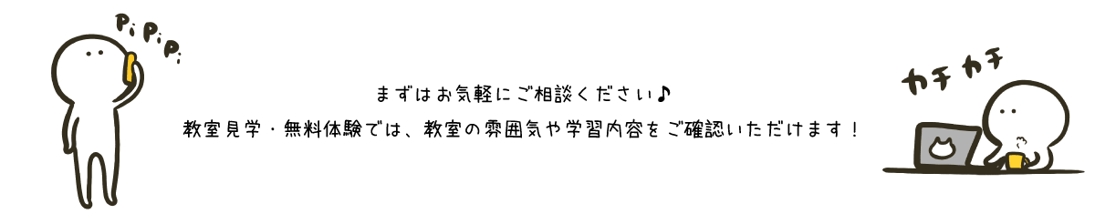 実際に教室へお越しいただき、雰囲気の確認や無料体験・ご相談を行います。お困りごとやご希望をお伺いし、一人ひとりに合った学び方をご提案いたします。無理な勧誘は一切ありませんのでご安心ください。